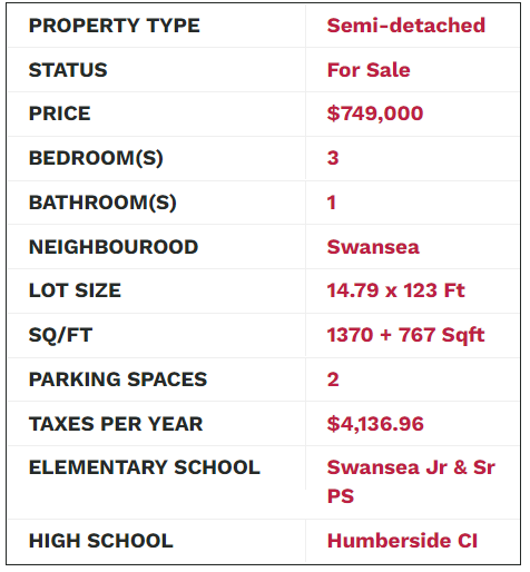 73 Morningside Avenue Located In Prime Swansea! This cozy & Sun-filled semi-detached home offers 3-bedrooms, 1-bathroom, a partially finished basement and detached garage. The main floor offers a sun-filled living room, hardwood flooring, wood trim, a spacious dining room, neutral decor and a huge eat-in kitchen that includes a walk out to the patio and beautiful perennial garden.